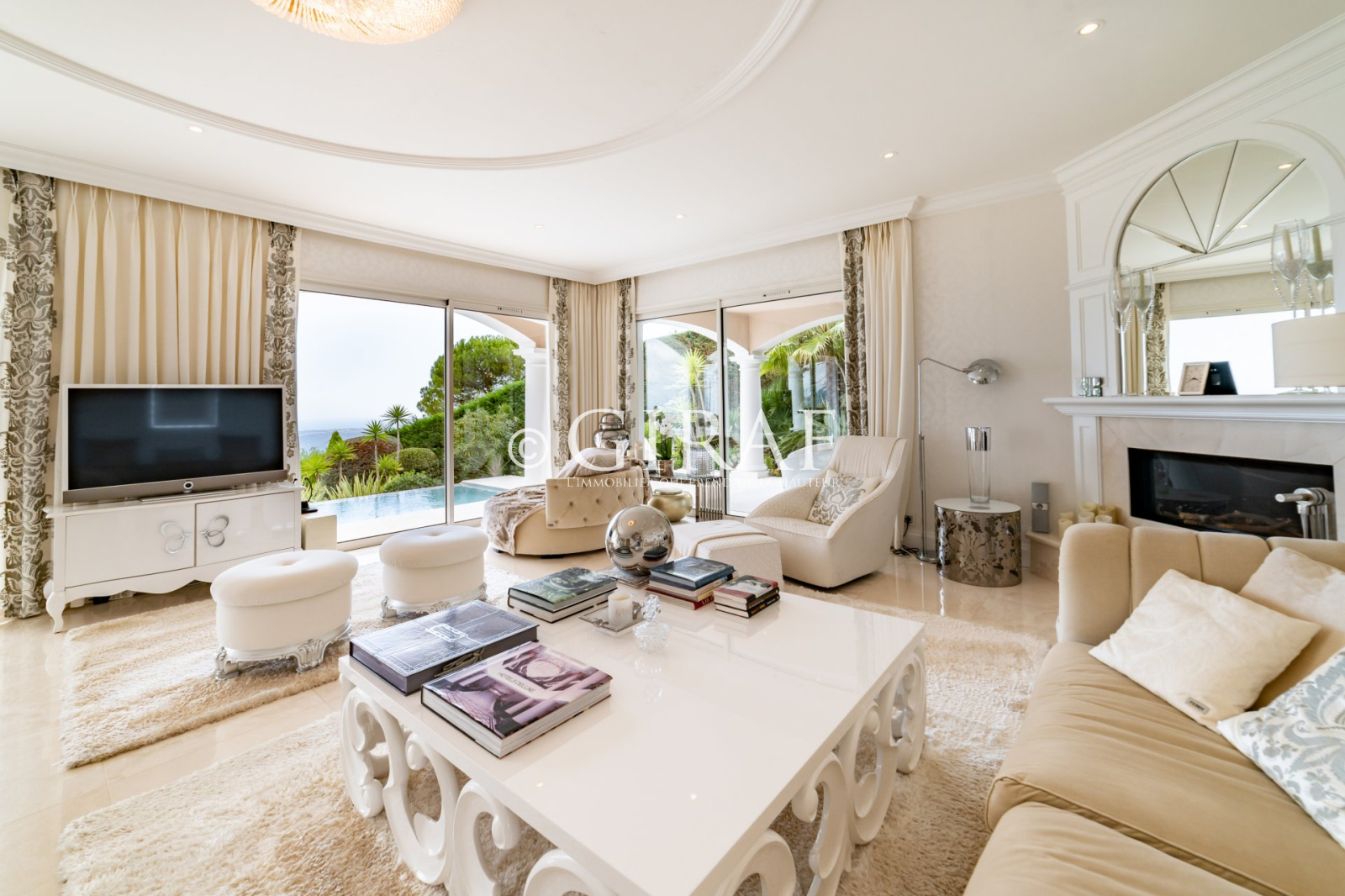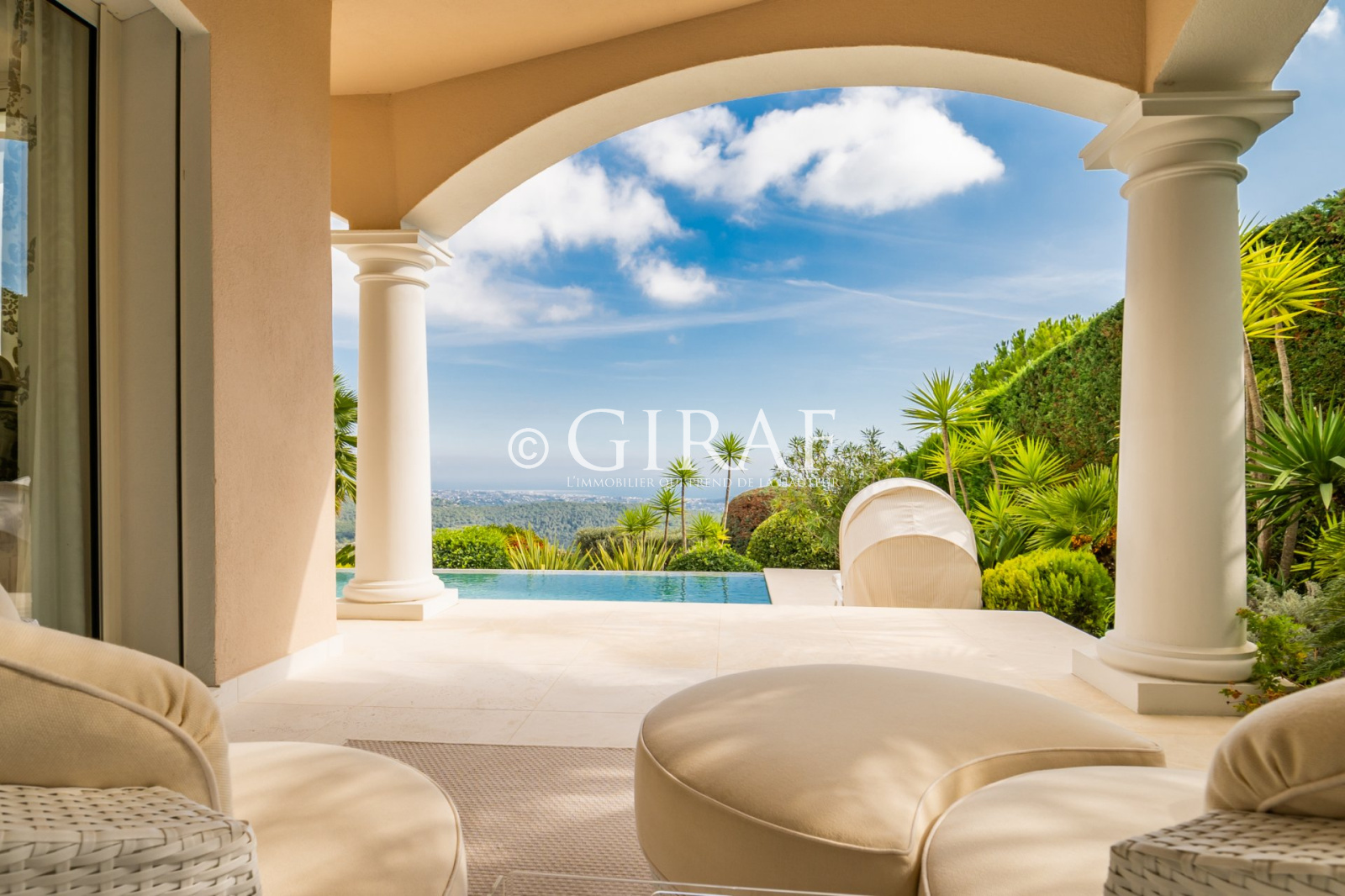 Superbe et trés élégante villa de prés de 200m2 située sur les hauteurs de Tourrettes sur loup et offrant une sublime vue mer panoramique sur toute la Côte d'Azur. Au calme, particulièrement lumineuse et en position dominante sans aucun vis-à-vis, l'intérieur trés soigné avec du mobilier et des prestations haut-de-gamme propose une entrée, grand salon, cuisine ouverte, salle de gymnastique, toilettes invités et à l'étage, 2 chambres chacune avec salle de douche et un grand bureau qui peut trés facilement être converti en chambre double. A l'étage inférieur, une chambre double indépendante avec salle de bain, buanderie, superbe salle de cinema haut de gamme, et un grand garage. De nombreux espaces extérieurs entourent la piscine à débordement. Jardin complanté, système d'alarme, portail électrique...