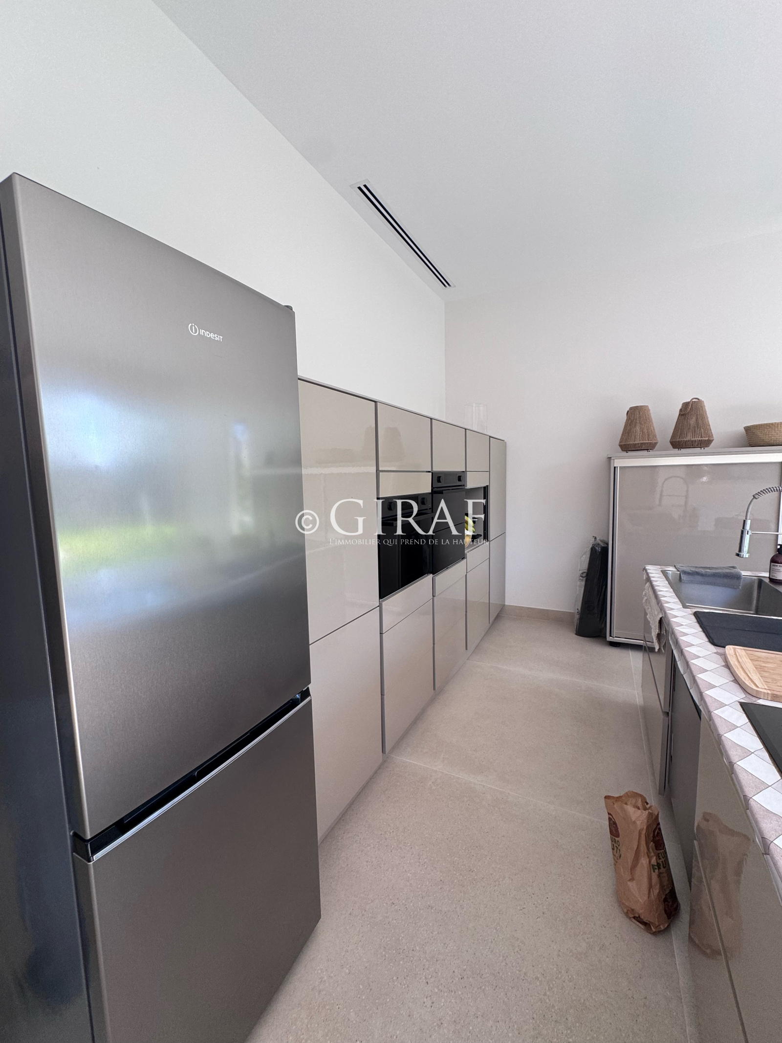 Son esprit contemporain et ses volumes lumineux offrent un cadre de vie à la fois moderne et chaleureux.La maison se compose d’un espace de vie spacieux et ouvert, baigné de lumière naturelle, avec une cuisine équipée au design épuré. Les matériaux de qualité et les finitions soignées soulignent le caractère résolument moderne de cette propriété.